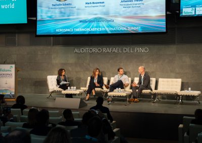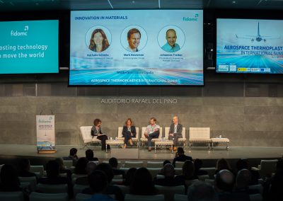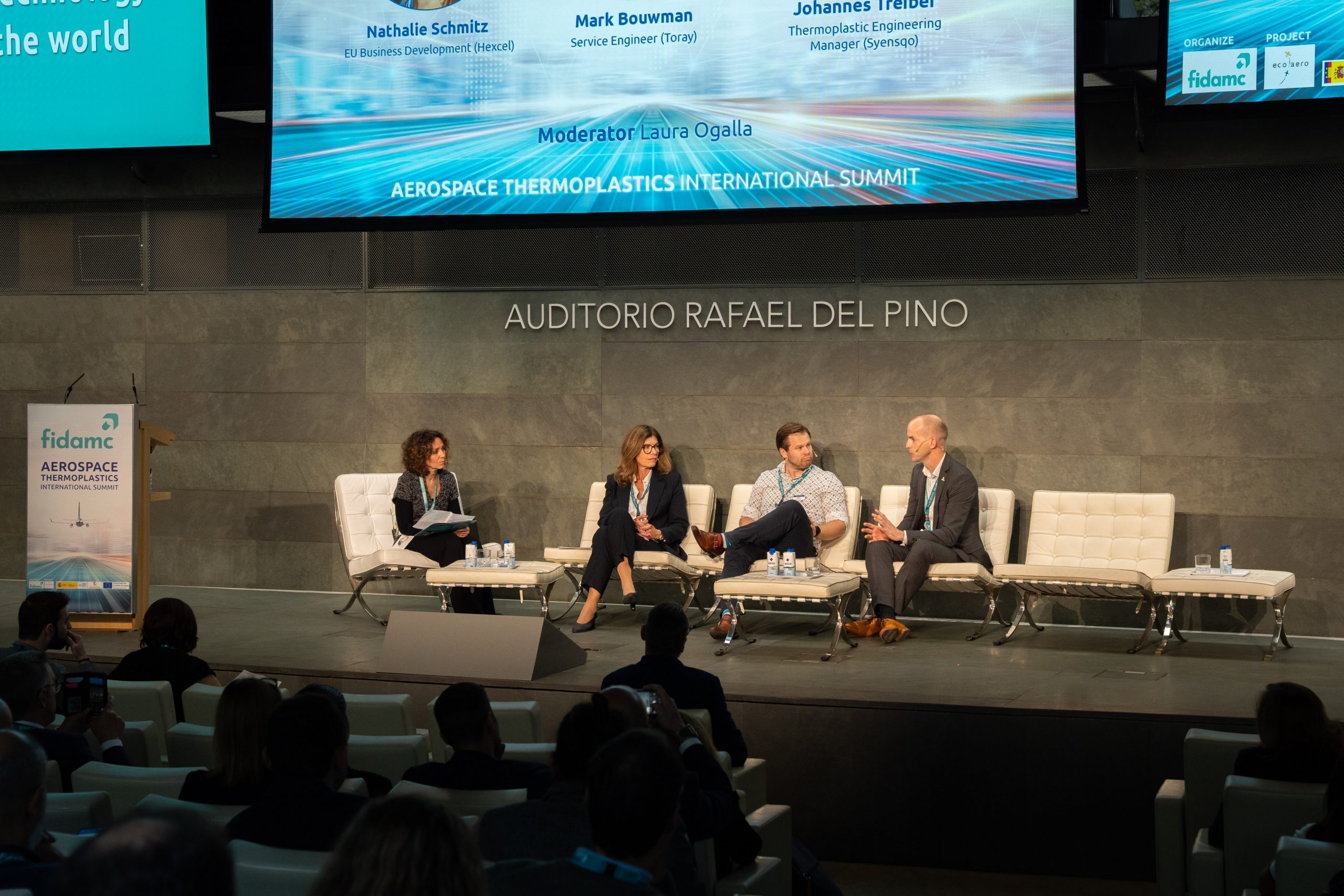 La quinta mesa redonda del Aerospace Thermoplastics International Summit reunió a tres referentes de la industria de materiales avanzados: Nathalie Schmitz (EU Business Development – Hexcel), Mark Bouwman (Service Engineer – Toray) y Johannes Treiber (Thermoplastic Engineering Manager – Syensqo). El debate, moderado por Laura Ogalla Escolano, Senior Project Manager de Fidamc, giró en torno a los desafíos y oportunidades de la innovación en materiales termoplásticos dentro del sector aeroespacial.