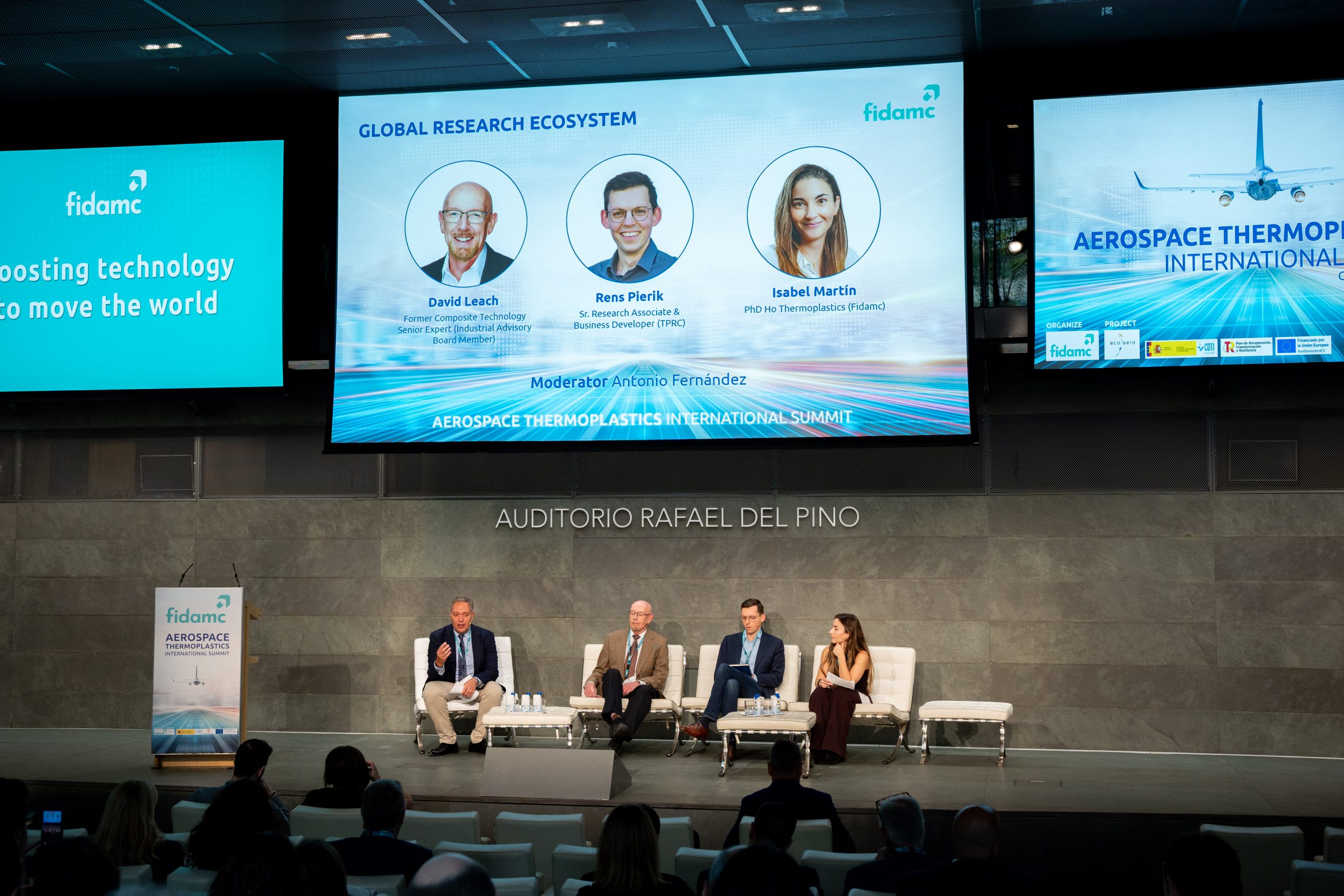 The sixth round table at the Aerospace Thermoplastics International Summit brought together leading figures from academia and industry to discuss the role of collaborative research in the adoption of thermoplastic materials in the aerospace industry. Moderated by Antonio Fernández, head of the Composite Materials and Intelligent Structures group at ETSIAE/UPM, the session featured David Leach (former Composite Technology Senior Expert – Industrial Advisory Board Member), Rens Pierik (TPRC) and Isabel Martín (Fidamc).