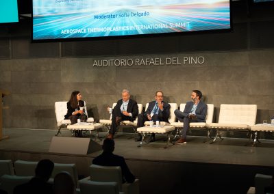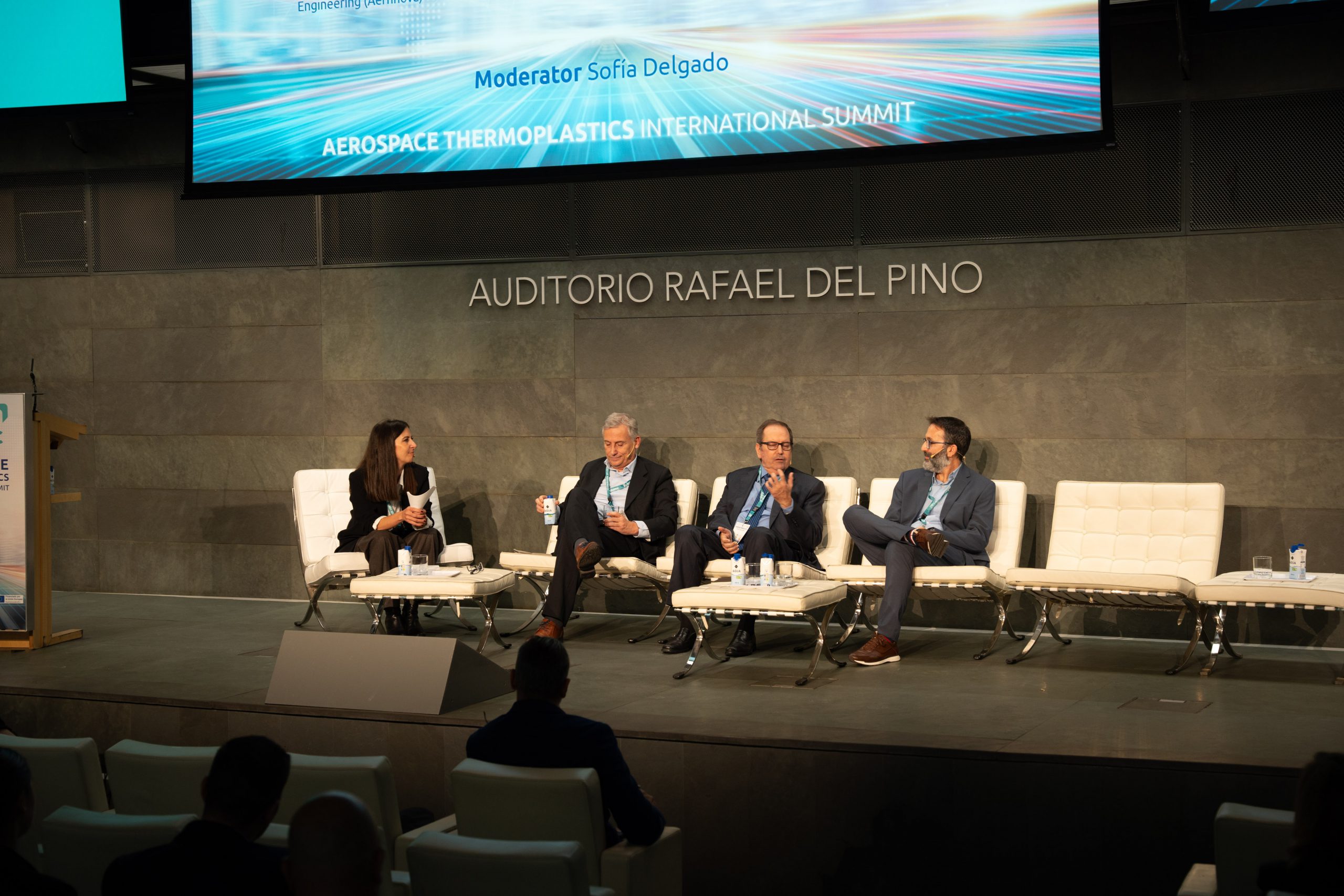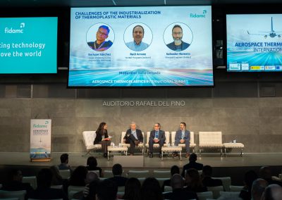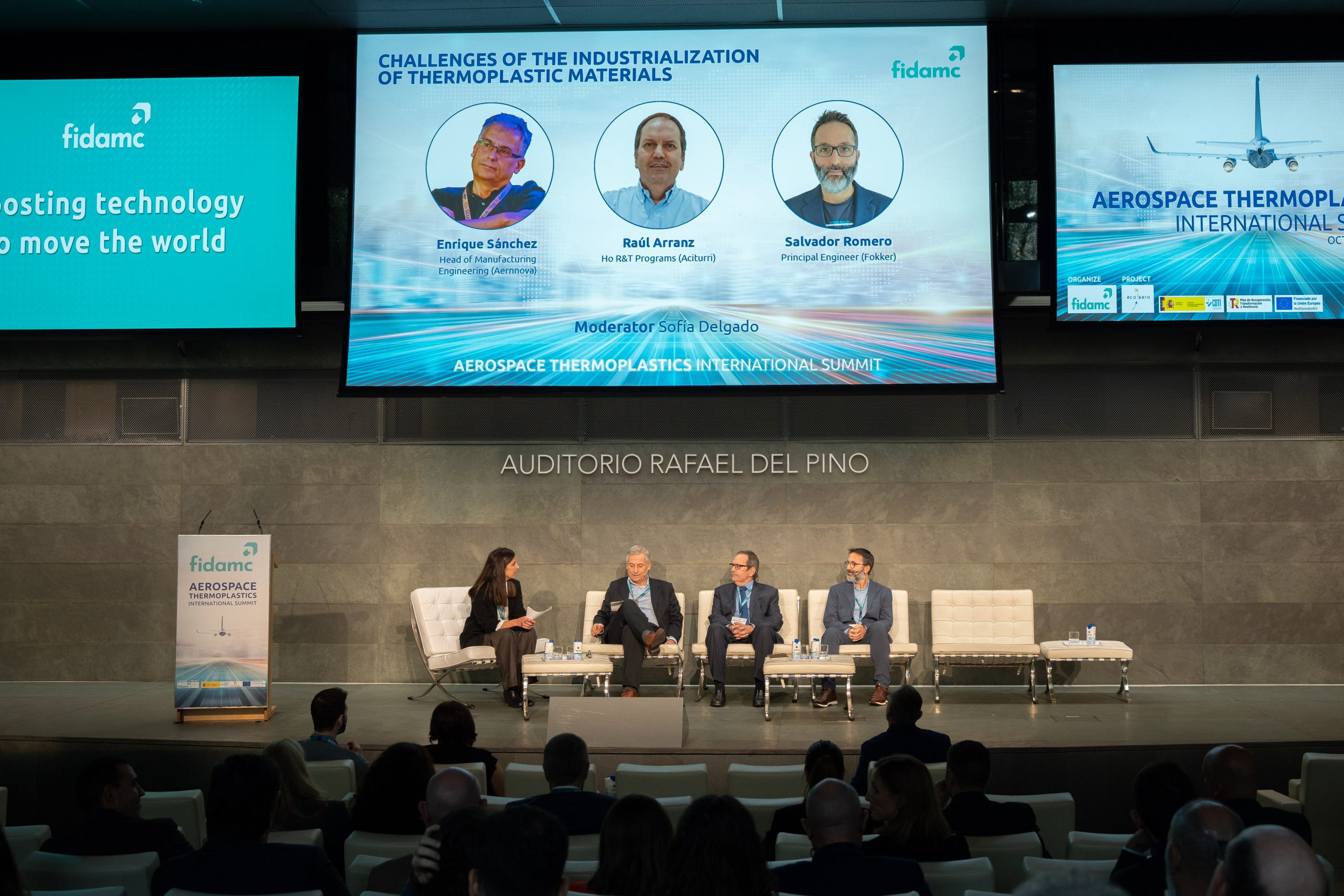 The third round table at the Aerospace Thermoplastics International Summit, organised by Fidamc, addressed one of the most crucial issues for the future of sustainable aviation: how to take thermoplastic materials from the laboratory to the factory. Entitled "Challenges of the industrialisation of thermoplastic materials", the debate was moderated by Sofía Delgado, Director of Aeronautical Programmes at Fidamc, and featured Enrique Sánchez (Aernnova Composites), Raúl Arranz (Aciturri) and Salvador Romero (Fokker).